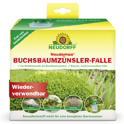 Con la trappola per tarme del bosso Neudorff Neudomon potrete proteggere efficacemente i vostri preziosi alberi di bosso dai temuti danni alle foglie. Questa intelligente trappola ai feromoni viene utilizzata per un controllo affidabile delle infestazioni e aiuta a determinare il momento ottimale per ulteriori misure. L'attrattivo sessuale altamente specifico attira solo le falene di bosso maschi. Ciò impedisce l'accoppiamento e riduce significativamente il numero di bruchi dannosi. La trappola non richiede insetticidi e non attira le api. Un set è sufficiente per una superficie del giardino fino a 200 metri quadrati e, con due depositi di attrattivi, copre l'intera stagione del giardino da aprile a settembre. Grazie alla struttura robusta è possibile riutilizzare la trappola per anni e riempirla semplicemente con una confezione di ricarica. Ciò significa che potete sempre tenere d'occhio il volo delle farfalle e, se necessario, reagire in tempo prima che i voraci bruchi causino ingenti danni alle vostre piante.