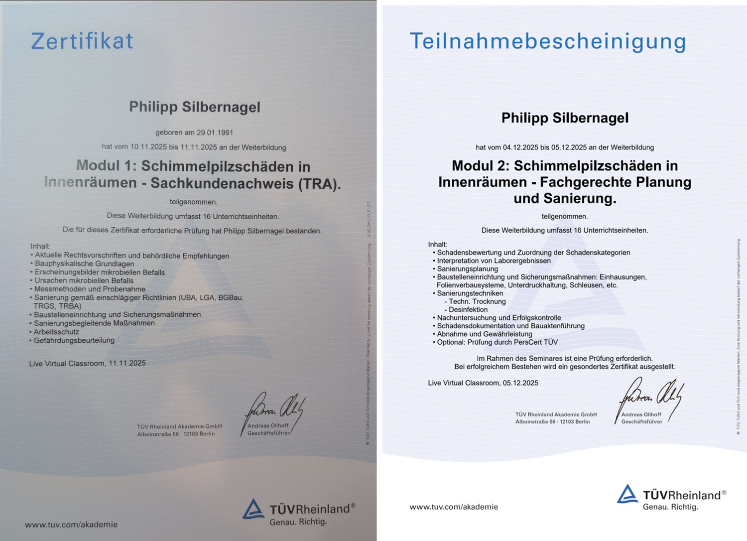Philipp Silbernagel ha superato con successo l'esame TÜV Rheinland per la valutazione dei danni da muffa negli ambienti interni – un attestato di competenza – e ha inoltre dimostrato di aver acquisito le competenze necessarie per la progettazione e la bonifica professionale dei danni da muffa. Queste competenze sono integrate nei nostri servizi di sviluppo prodotti e consulenza.