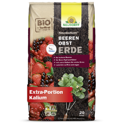 Se volete raccogliere deliziose bacche nel vostro giardino o sul balcone, avete bisogno della giusta base per le vostre piante. Con il terriccio per frutti di bosco Neudorff NeudoHum creerete condizioni di crescita ottimali per fragole, lamponi, more e uva spina. Questo terriccio speciale di alta qualità è completamente privo di torba ed è composto da materie prime rinnovabili, il che lo rende una scelta moderna per il vostro giardino progetto Grazie alla porzione extra di potassio, il terreno di coltura favorisce un raccolto particolarmente ricco e aromatico. Allo stesso tempo, la struttura sciolta garantisce un perfetto equilibrio di acqua e aria, che previene efficacemente pericolosi ristagni d'acqua in vasi, vasi o aiuole rialzate. Il terreno è già pre-fertilizzato per le prime tre o quattro settimane, in modo che le vostre piante siano ben curate subito dopo la semina. Sia che stiate allestendo un letto di bacche o rinvasando le vostre piante in vaso sulla terrazza, questo terriccio consigliato da NABU offre il vostro. i cespugli di bacche esattamente le sostanze nutritive di cui hanno bisogno per una crescita sana delle radici e tanti frutti dolci.