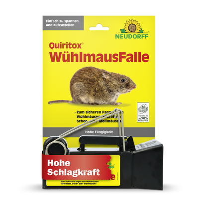 Quando le arvicole scavano nel vostro giardino e distruggono le radici delle piante, è necessario intervenire rapidamente. La trappola per arvicole Neudorff Quiritox offre una soluzione altamente efficace per il controllo di arvicole, topi di campagna e arvicole acquatiche. Questa trappola meccanica a scatto si distingue per l'altissimo tasso di cattura e la facilità d'uso. Grazie alla sua struttura chiusa e ben progettata, la luce e l'aria che potrebbero disturbare la cattura vengono impedite, aumentando significativamente il tasso di successo. È sufficiente innescare la trappola con della verdura fresca e azionarla con un solo gesto. Il potente scatto garantisce l'uccisione dei parassiti. Un ulteriore vantaggio per l'utente è il design igienico: gli animali intrappolati possono essere rimossi completamente senza toccarli. Questa robusta trappola per arvicole può essere utilizzata tutto l'anno, è riutilizzabile tutte le volte che è necessario ed è una soluzione puramente meccanica, senza l'utilizzo di agenti chimici. In questo modo potrete proteggere efficacemente aiuole, prati e alberi da frutto dalla defogliazione sotterranea e ripristinare rapidamente l'ordine nel vostro giardino.