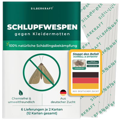 Le vespe parassite ne hanno solo unobreve durata, motivo per cui è necessario averliininterrottamente per diverse settimanesi applica. Quando ordini vespe parassite per combattere le tarme dei vestiti, nuove vespe parassite vengono inviate a casa per posta a determinati intervalli. Nel complesso, ci sono tarme dei vestitisei parti distribuiti su un totale di 18 settimanediventare. Non appena le nuove carte vespe parassite saranno nella cassetta delle lettere, potranno essere scambiate con le vecchie carte. Ciò garantisce che il trattamento con le vespe parassite continui in ogni momento.